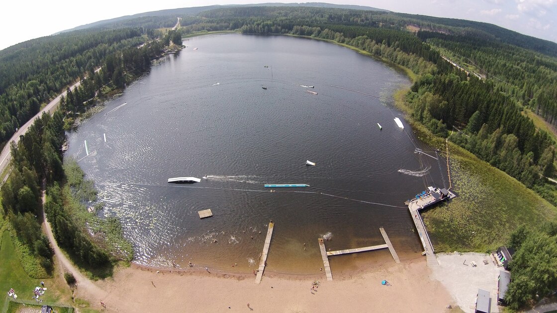 Fagersta Cable Park is Sweden's first "full size Wakeboard Cable Park". With a cable lift system consisting of 6 towers spread at 70 to 150 meter intervals, 7-8 people can simultaneously ride around in a "skateboard park" on water with different kickers and rails. The cable park is perfect for all ages, from beginners to the most extreme wakeboarders.